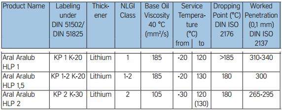 Aral Aralub HLP 1Aral Aralub HLP 1.5Aral Aralub HLP 2鋰基極壓潤滑脂,應用於動力刹車器、鏈條及齒輪裝置及傳動軸等震動負荷所需之潤滑。撓曲和耐老化通用EP與礦物油基潤滑脂。可靠的防腐蝕高應力軸承的磨損保護中、低轉速,包括混合摩擦。… [了解更多]