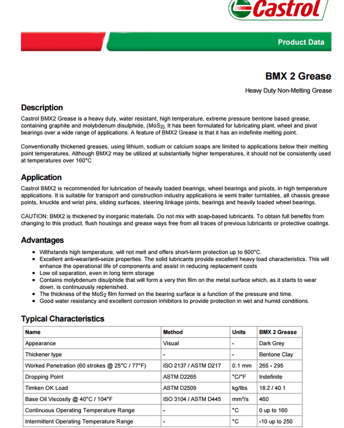 嘉實多BMX2被推薦用於重負荷軸承的潤滑,軸承和軸,在高溫