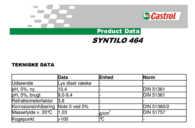 Castrol Syntilo 464產品描述syntilo 464是人工合成的是適用於範圍廣泛的材料。經營範圍syntilo 464研磨加工技術。鋼、鑄鐵和青銅色和某些類型的塑料。syntilo 464提供了一個很好的和生物穩定。此外,單乙醇胺產品是免費的,因此可以方便的使用,… [了解更多]