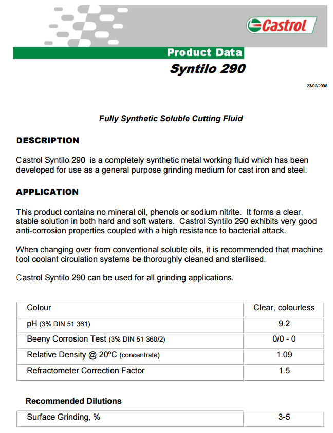 Castrol Syntilo 290全合成水溶性切削液描述嘉實多Syntilo 290是一種全合成金屬加工液,已用於鑄鐵和鋼的通用磨削介質的開發。應用本產品不含礦物油、酚類或亞硝酸鈉。它形成一個明確的,硬和軟水域的穩定解決方案。嘉實多Syntilo 290有很好的抗腐蝕性能加上… [了解更多]
