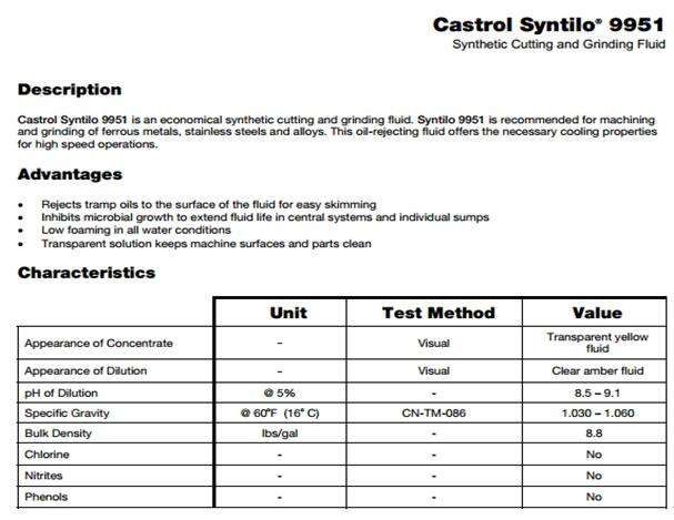 嘉實多CASTROL SYNTILO 9951 合成切削液描述嘉實多Syntilo 9951是一種經濟合成切削磨削液。Syntilo 9951推薦用於加工和黑色金屬的磨削,不鏽鋼和合金。這排油液提供必要的冷卻性能高速操作。優勢•廢品油為容易瀏覽的流體的表麵•抑製微生物的生長在中央… [了解更多]