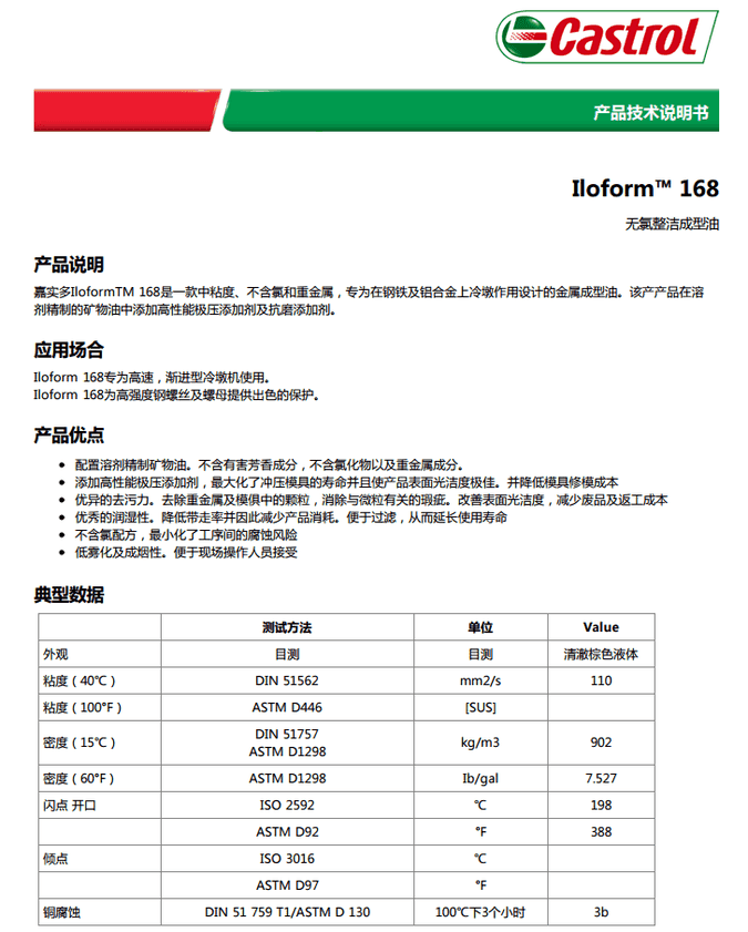 嘉實多Iloform 168是一款中粘度、不含氯和重金屬,專為在鋼鐵及鋁合金上冷墩作用設計的金屬成型油。該產產品在溶 劑精製的礦物油中添加高性能極壓添加劑及抗磨添加劑。 應用場合