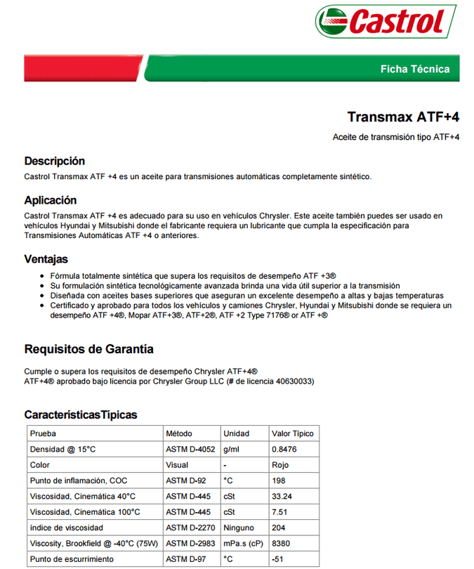 Castrol Transmax ATF +4批準許可證(許可證#克萊斯勒集團有限責任公司40630033)