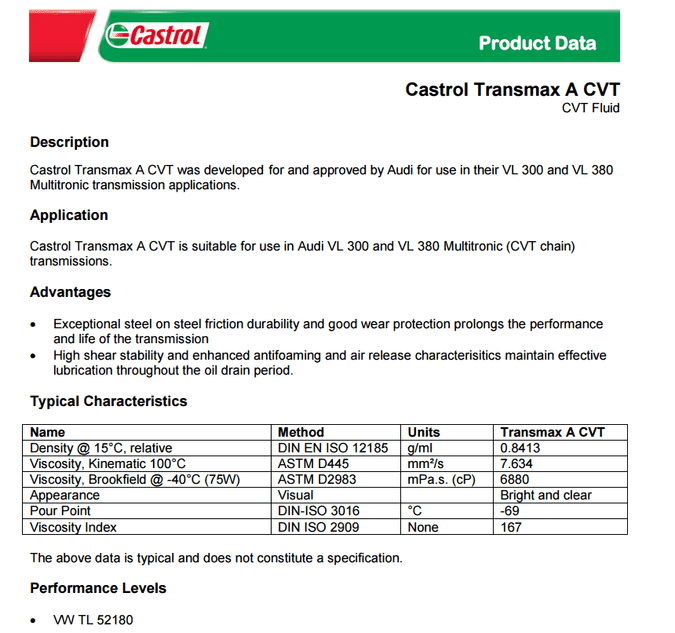 Castrol Transmax A CVTTransmax A CVT無級變速器油描述嘉實多transmax A無級變速器是由奧迪開發和批準使用的300和VL(VL)380multitronic傳輸應用。應用嘉實多transmax A無級變速器奧迪是適合使用在300和VL(VL…… [了解更多]