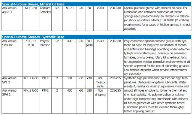 Aral Aralub 4807 D礦物油基專用潤滑脂。對於摩擦的潤滑與腐蝕防護伸縮式減震器中主要用於鐵路的彈簧。符合TL B 1400.1(。版)要求潤滑脂在衝擊摩擦彈簧吸收器。Aral Aralub SPU 1/2聚尿素專用潤滑脂潤滑摩擦長期合成基礎油在極高溫下工作的防摩擦軸… [了解更多]