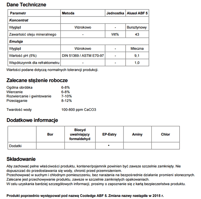 chłodząco - smarującą。不含硼化合物、胺化合物和甲醛,氯的分泌。包含