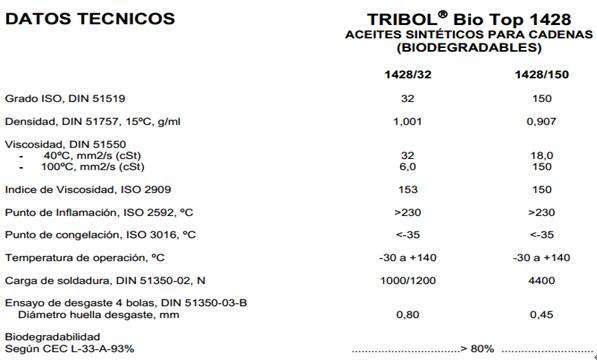 嘉實多Tribol BioTop 1428/32 可生物降解鏈條油嘉實多Tribol BioTop 1438/150 可生物降解鏈條油嘉實多Tribol BioTop 1428是專為鏈條潤滑,那裏的溫度可以到+140嘉實多Tribol BioTop 1428是基於合成酯油。根據C…… [了解更多]