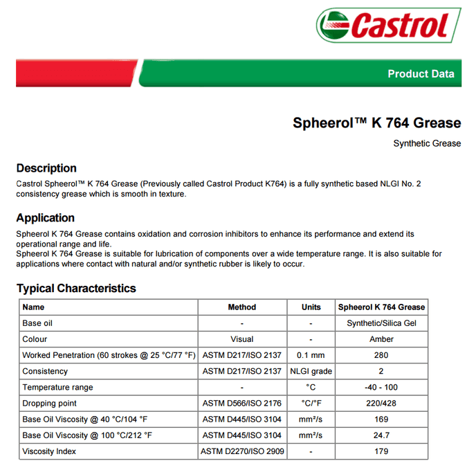 嘉實多spheerol K 764潤滑脂(以前稱為嘉實多的產品k764)是一種全合成的NLGI 2號