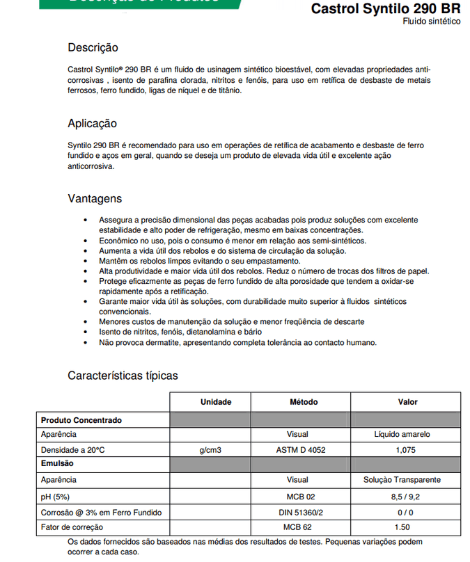 Castrol Syntilo 290 BR描述Castrol Syntilo 290 BR高防腐性能無亞硝酸鹽和酚類化合物,氯化石蠟,用薄金屬磨床有色金屬、鑄鐵、鎳合金和鈦。應用syntilo 290分為粗加工和磨削操作的鐵鋼和鑄鐵在一般情況下,當一個產品的壽命高和出色的行動防… [了解更多]