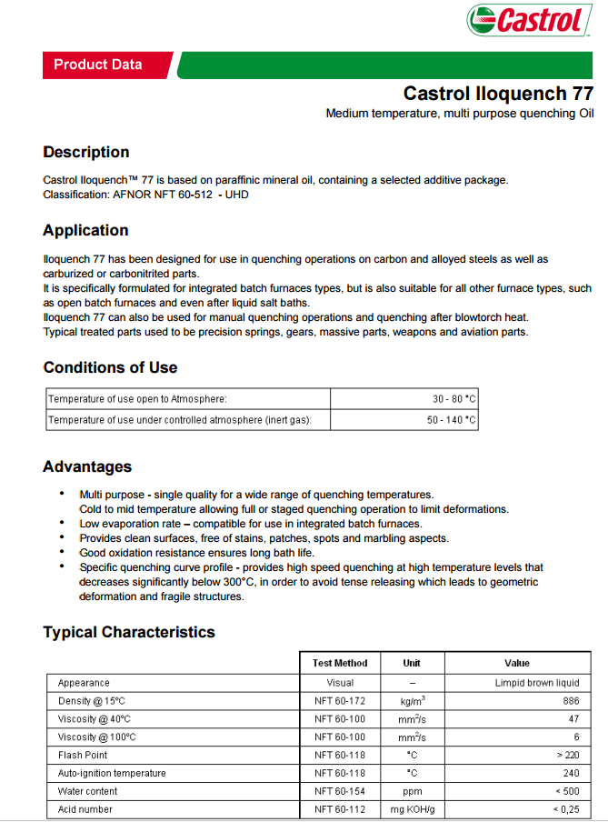Castrol Iloquench 77Iloquench 77中溫、多用途淬火油描述嘉實多iloquench 77石蠟基礦物油,含有精選的添加劑。分類:AFNOR NFT 60-512 - UHD應用iloquench 77被設計為使用碳和合金鋼淬火操作以及滲碳或carboni…… [了解更多]