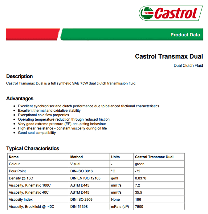 Castrol Transmax Dual用(yong)於(yu)最(zui)新(xin)的(de)雙(shuang)離(li)合(he)器(qi)傳(chuan)動(dong)技(ji)術(shu)的(de)全(quan)合(he)成(cheng)傳(chuan)動(dong)液(ye)。特(te)點(dian)和(he)優(you)點(dian)由(you)於(yu)其(qi)優(you)良(liang)的(de)同(tong)步(bu)和(he)均(jun)衡(heng)的(de)摩(mo)擦(ca)離(li)合(he)器(qi)的(de)性(xing)能(neng)優(you)良(liang)的(de)熱(re)穩(wen)定(ding)性(xing)和(he)氧(yang)化(hua)穩(wen)定(ding)性(xing)特(te)殊(shu)冷(leng)流(liu)特(te)性(xing)減(jian)少(shao)摩(mo)擦(ca)降(jiang)低(di)工(gong)作(zuo)溫(wen)度(du)非(fei)常(chang)好(hao)的(de)極(ji)壓(ya)(極壓)抗點蝕行為高抗剪切性,在石油壽命中的恒定粘度密封相容性好規格/技術數… [了解更多]