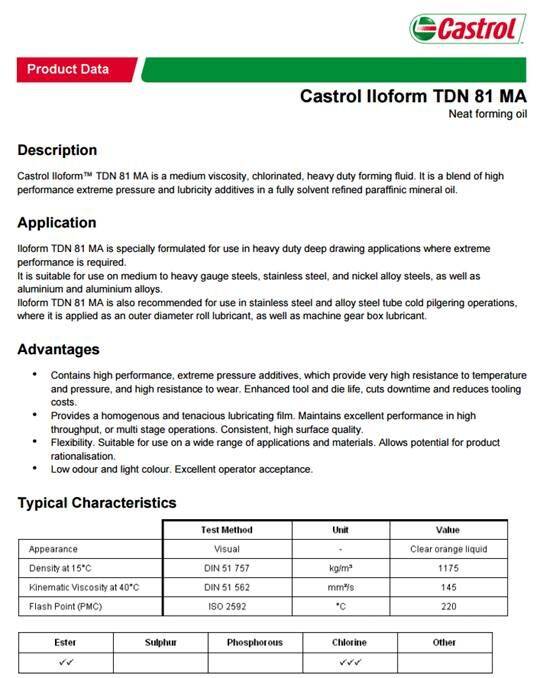 Castrol Iloform TDN 81 MA是專為使用重型拉深應用在極端性能是必需的。