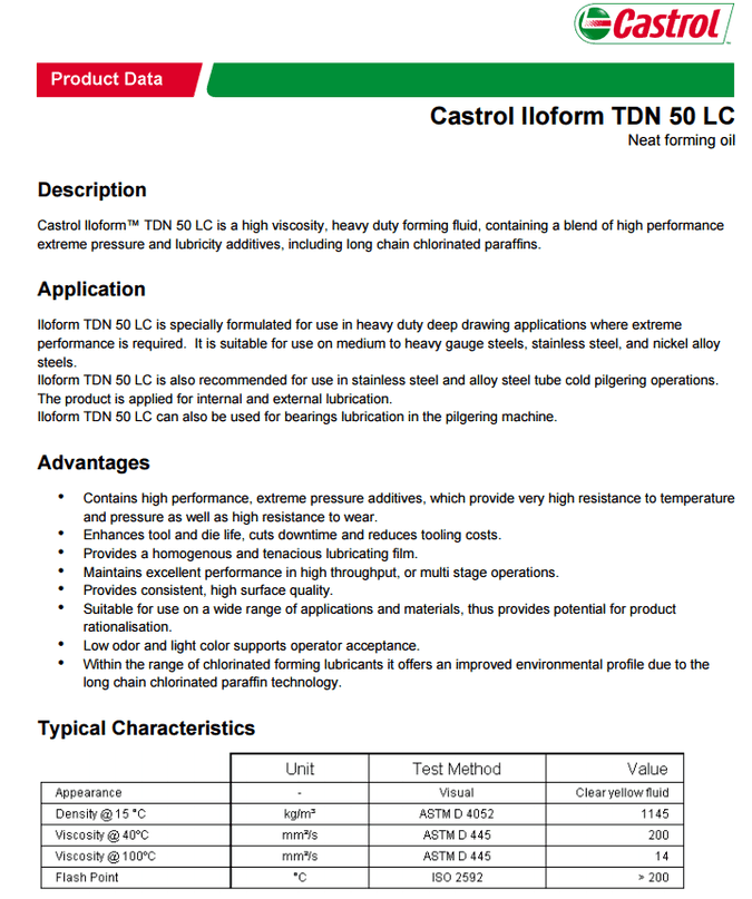 嘉實多lloform TDN 50 LC整潔成型油描述嘉實多lloform TDN 50 LC是一種高粘度,重型形成流體,包含一個高性能的共混物極壓潤滑添加劑,包括長鏈氯化石蠟。應用iloform TDN 50 LC是專為使用重型拉深應用在極端性能是必需的。適用於中、厚規格鋼、不… [了解更多]