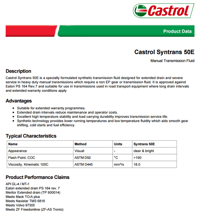 Castrol Syntrans 50E手動變速箱油描述嘉實多Castrol Syntrans 50E是專門製定了綜合傳動液專為延長流失嚴重在需要非極壓齒輪或傳動液的重型手動變速器中的服務。它被批準反對伊頓聚苯乙烯164修訂版7,適用於道路運輸設備中使用的變速器,其中長的排水間隔… [了解更多]