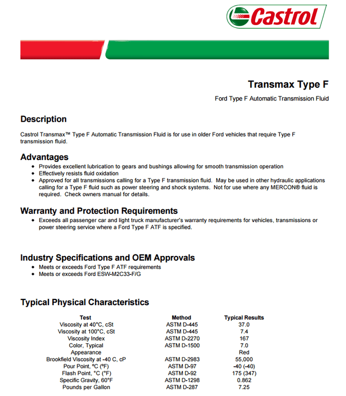 Castrol Transmax Type F自動變速器油是用於舊的福特汽車需要F型