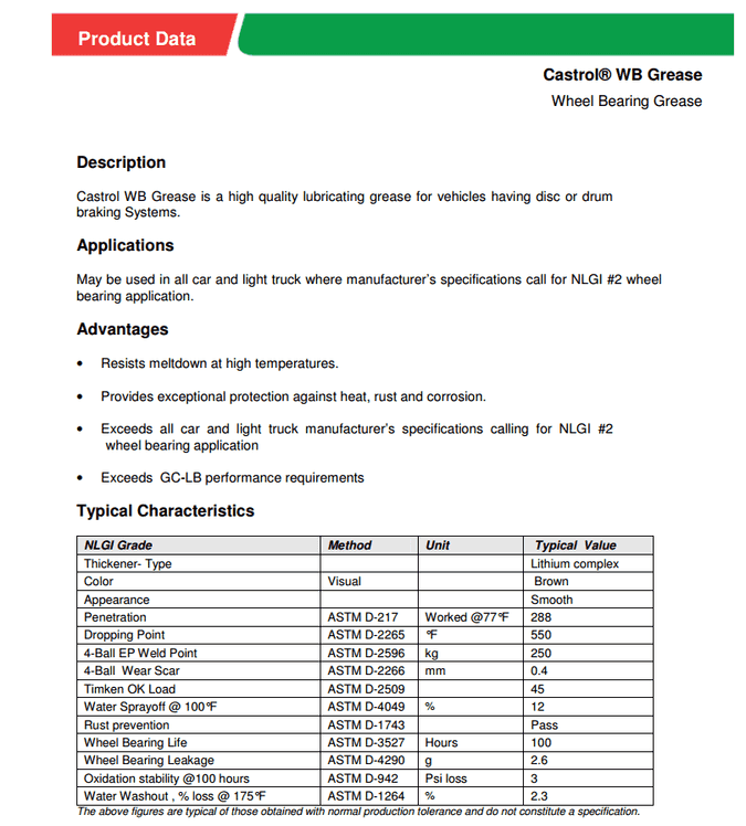 Castrol WB Grease車輪軸承潤滑脂描述嘉實多WB潤滑脂是一種高質量的潤滑脂具有盤或鼓車製動係統。應用可用於所有的轎車和輕型卡車在製造商的規格要求# NLGI 2輪軸承的應用。優勢在高溫下抵抗融化。提供特殊的保護,防止熱,生鏽和腐蝕。超過所有的轎車和輕型卡車製造商的規… [了解更多]