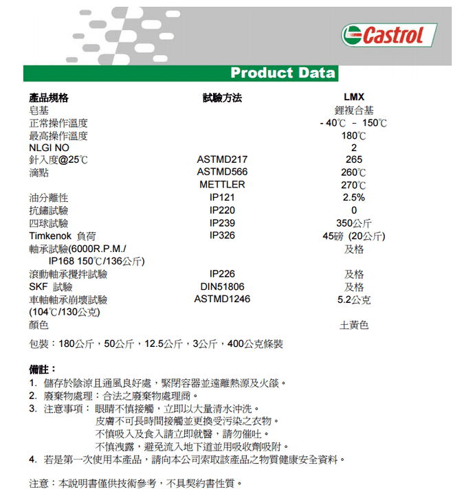 CASTROL LMX係一鋰複合基添加極壓添加劑的黃油脂,有較高的低點約260℃較少